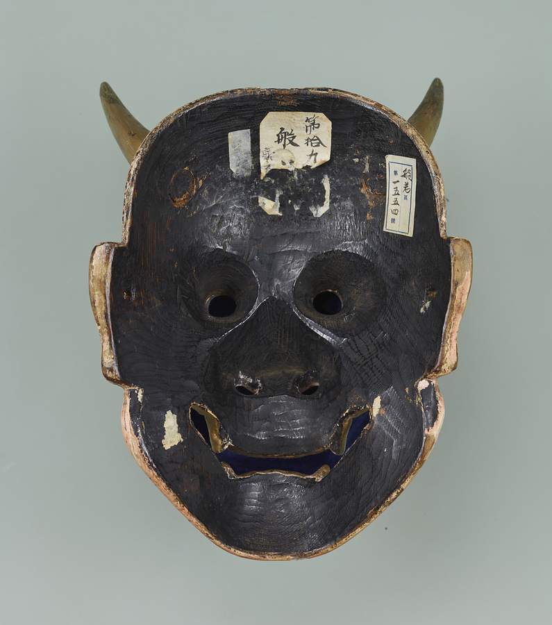 般若は、『葵上(あおいのうえ)』『道成寺(どうじょうじ)』などに用いられる鬼女の面。2本の角、金属で覆(おお)い金色に表した眼が光り、髪が乱れ、口角が大きく裂ける。八の字の眉は激しい恨みの奥に秘めた、高貴な美しい女性の深い孤独と悲しみ、苦しみを感じさせる。(150707_h14)