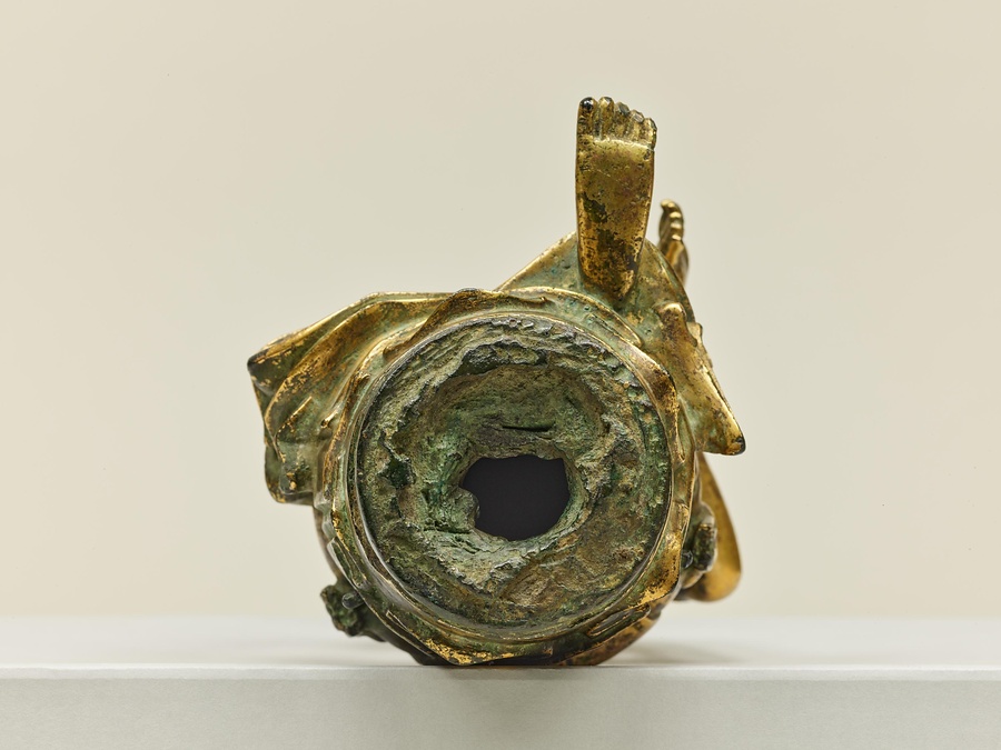 銅の表面に金メッキをしてつくられたこの仏像は、霊山として知られる和歌山県・那智山の経塚から掘り出されました。経塚とは、土の中に、経典の入った経筒や、鏡、仏像などを埋めておさめた場所のことです。平安時代後期に、釈迦の死後二千年経つと仏の教えが衰えてしまうという末法思想(まっぽうしそう)が流行した際、56億7000万年後にこの世に登場して人々を救済するとされたのが弥勒菩薩でした。そのときまで仏の教えを残すため、人々は経塚をつくったのです。いわば56億7000万年後の未来に向けたタイムカプセルに、この仏像はおさめられていました。