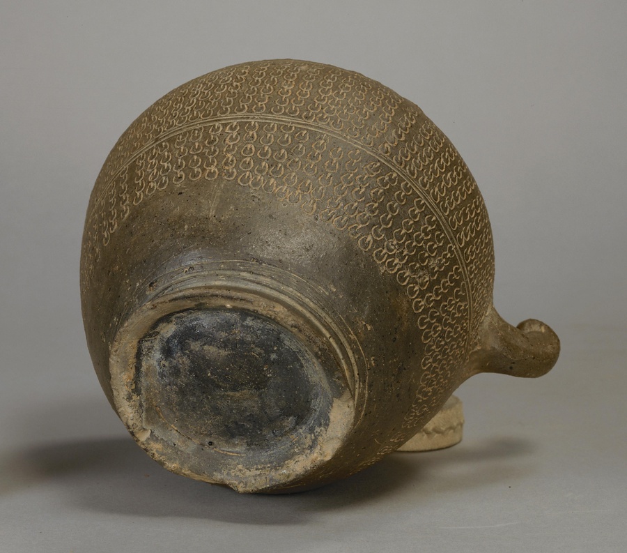 7世紀になると、ヘラ描き紋の意匠(いしょう)にとらわれない、印花紋土器の独自の紋様が生まれる。朝鮮半島の統一間近に製作された本作では、円形のスタンプを表面全体に押している。本作のような文様をたやすく施すため、統一新羅時代には縦長連続紋(たてながれんぞくもん)が考案された。(旧)