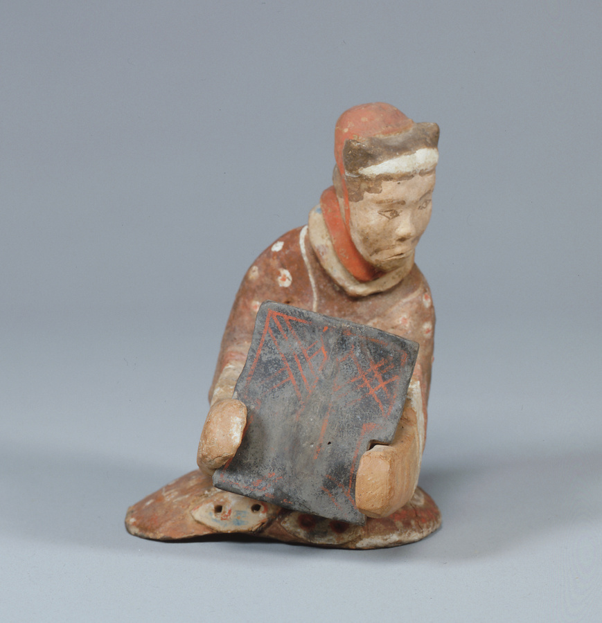 3体の俑のうち、1体は楯を持っています。他の2体は、本来、何らかの打楽器を手にしていたものと推測されます。このことから、楯をもつ俑は音楽に合わせて舞踏する人物を表したものかもしれません。髪型や服装の違いから、2体は男性で1体は女性であると区別できます。