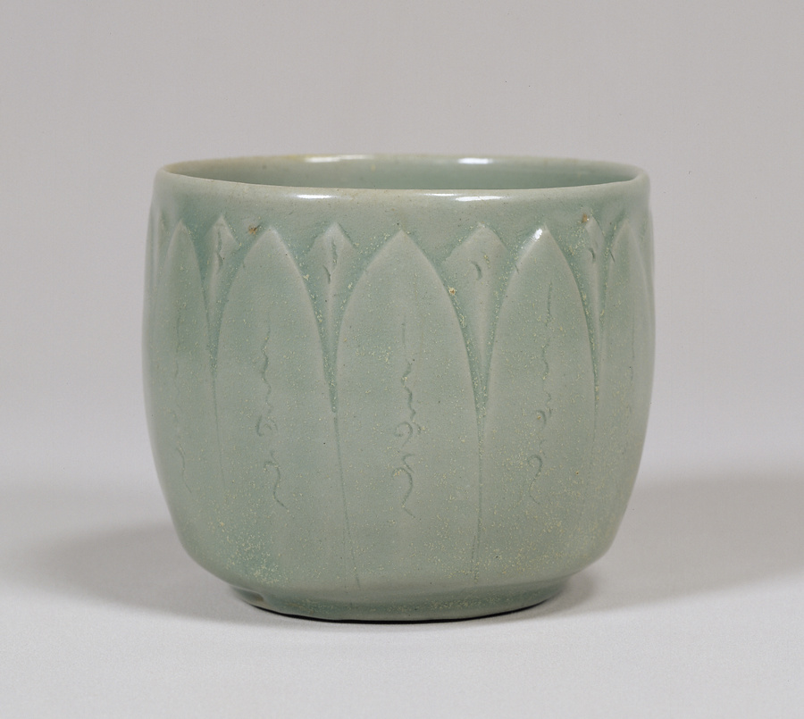 筒型の胴の外面に大ぶりの蓮弁文が彫りあらわされている。高麗青磁独特の澄んだ青緑色の釉薬が総体に施されており、底裏に3つの硅石目(けいせきめ)跡がある。朝鮮半島西南部の全羅南道康津(チョルラナムドカンジン)もしくは全羅北道扶安(チョルラプクドプアン)で焼かれたものとみられる。