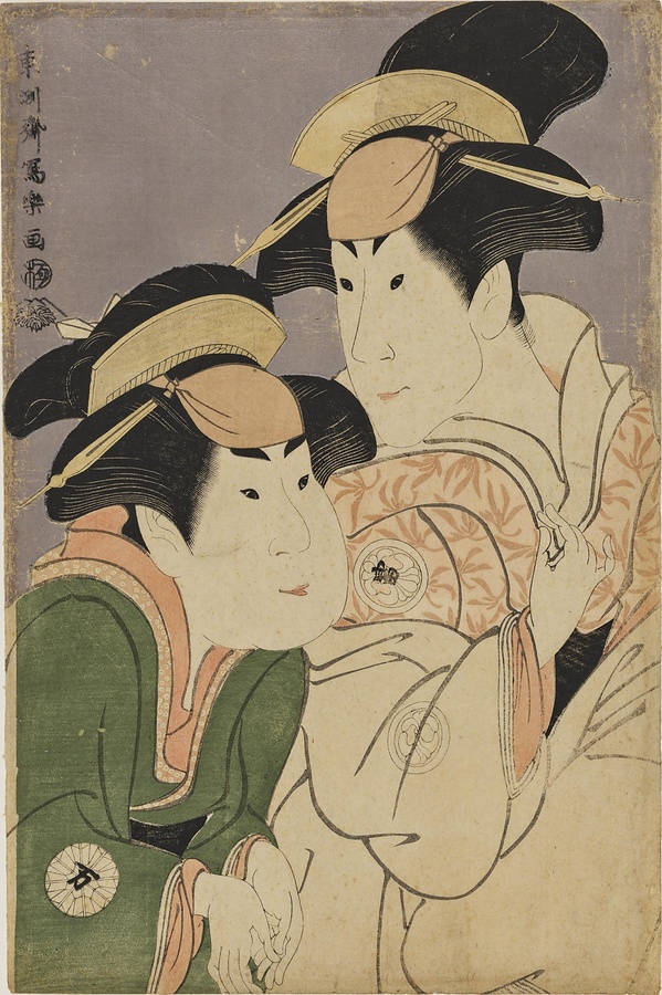 寛政6年5月都座で上演の「花菖蒲文禄曽我(はなあやめぶんろくそが)」に取材した作品。大岸蔵人の妻を演じる二代目瀬川富三郎を右側に、大岸家の腰者を演じる中村万世を左に配している。細面でしまった顔立ちの富三郎とぽっちゃりした万世が対比的に描かれている。