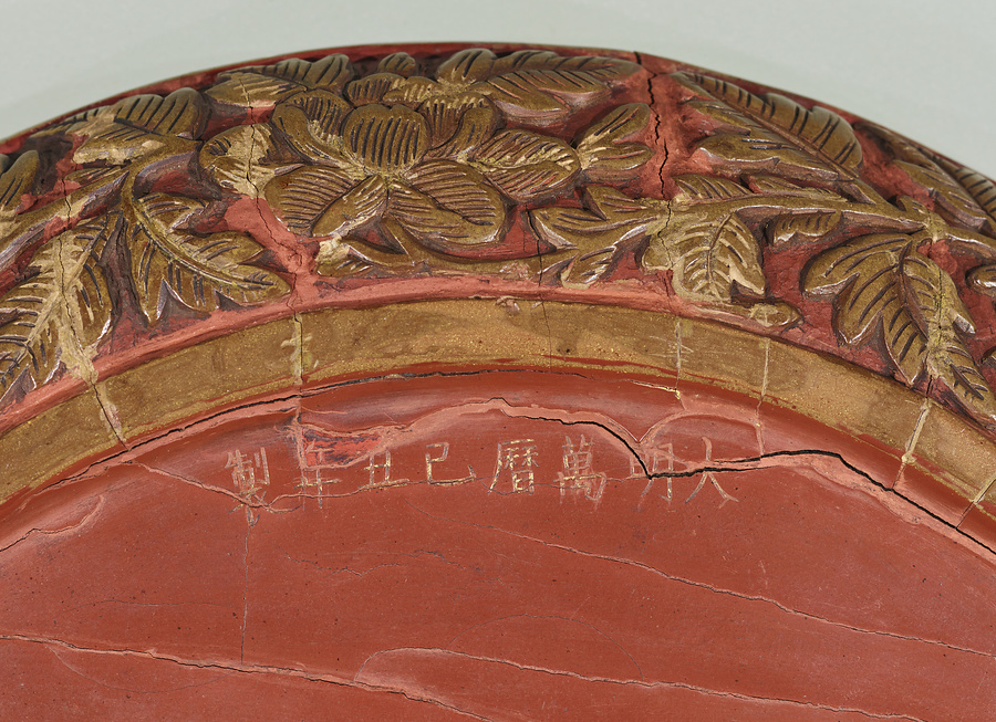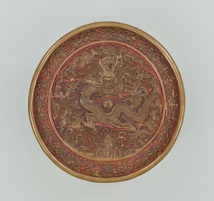 彫漆の一種で、黄漆を塗り重ねて文様を彫り表わす技法を、日本では堆黄(ついおう)(中国では剔黄(てきおう))とよんでいます。遺例のほとんどが地を朱漆塗として、五爪【ごそう】の龍を表わした作品です。また万暦【ばんれき】年間(1573~1620)の銘をもつ作例が多く、この頃を中心に隆盛した技法とみられています。