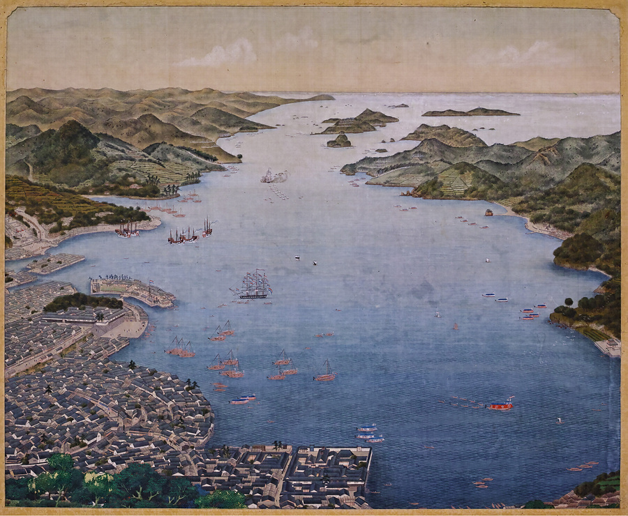 現在のJR長崎駅付近の上空に視座を設定して、19世紀の長崎とその港の景観を俯瞰しています。画面左中央あたりに当時の長崎の中心部、唐人屋敷・出島・長崎奉行所が描かれ、それをとりまく市街地の様子も克明に描かれています。