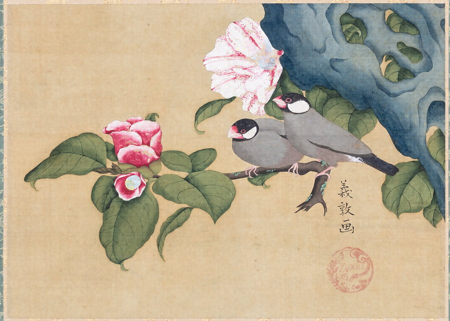 寄り添いながら椿の枝にとまる2羽の文鳥。その枝先には、3輪の椿の花が可憐に咲いています。右上には曲線を連ねた太湖石が配されており、陰影で微妙な立体感と量感を表現しています。小品ながらも、端正な美しさでまとまりのある作品です。花鳥と太湖石の組み合わせは東洋絵画ではしばしば見られますが、曙山は太湖石に藍とプルシアンブルーを重ねて使用しており、独特のグラデーションを生み出している。曙山の「松に椿に文鳥図」(個人蔵)や「竹に文鳥図」(秋田市立千秋美術館蔵)には、同種の文鳥が描かれており、小さな珍鳥は曙山お気に入りのモチーフだったと考えられます。