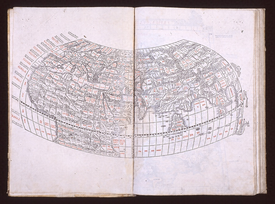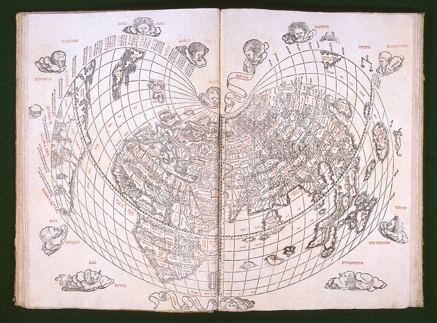 2世紀に活躍したプトレマイオスの世界観を復活させた地図帳。所収図は、16世紀初頭の最新情報に基づいた地図ではなく、古代に把握していた地理情報が中心となっています。ただ、巻末には中近東社会を中心に据えたハート型の新しい世界図が付され、西端には新世界アメリカ大陸を、そして東端には海岸線が不分明なアジアがみえます。さらにその東には三角形の形状をした“ZAMPAGU.INS.”(日本島)が描かれています。日本は、当時の基準子午線カナリア諸島から東に140~150度、経度からすればほぼ正しい位置にあります。地図の周囲には、蟹や天秤といった星座とともに風の神を描いています。