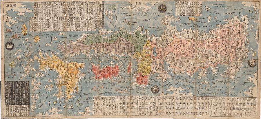 石川流宣は菱川師宣の弟子といわれています。浮世絵師として活躍したほか、世界図・江戸図なども刊行した地図作成者としても有名です。彼の手になる日本図は記載事項が豊富で、絵画的要素も強く、江戸時代中期を通して人気を呼び、改版も多く出されました。この貞享4年図は、流宣日本図の初期のもの。流宣が描く「日本」の姿は、東北地方が短いなど正確さが無視されていること、実際以上に海岸線の屈曲が見られることでしょう。しかし、これは多くの情報を記載するためとの指摘もあります。この情報の詳しさは、地図の上だけでなく、東海道の宿駅や主要街道の里程などの一覧表を付したところにも表れています。