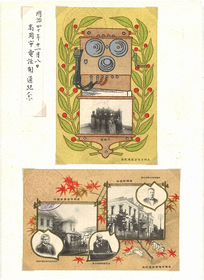 本資料は、高岡市の電話が開通したことを記念して発行された絵葉書である。モノクロの写真が印刷され、背景にはカラーの絵が印刷されている。資料②(横長)に関しては、背景の絵や写真縁取りにエンボス加工が施されている。また、台紙に貼り付けされており、台紙左上部には「明治四十年十一月八日/高岡市電話開通紀念」と書かれた紙も貼り付けられている。