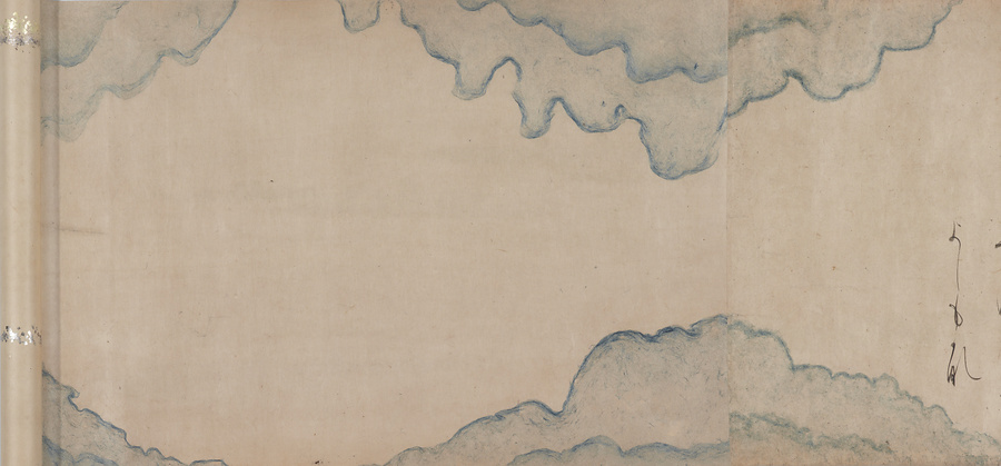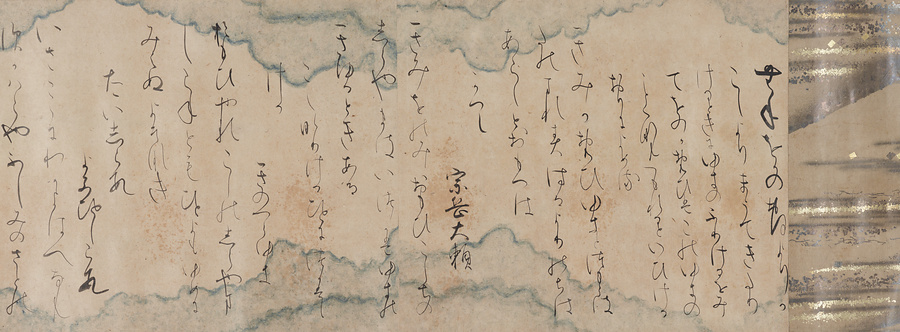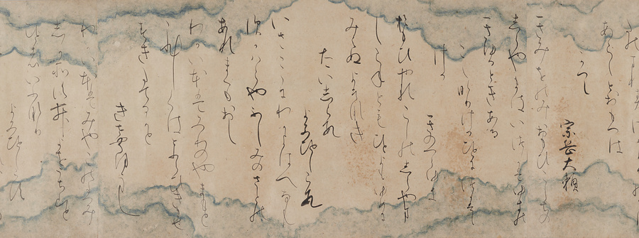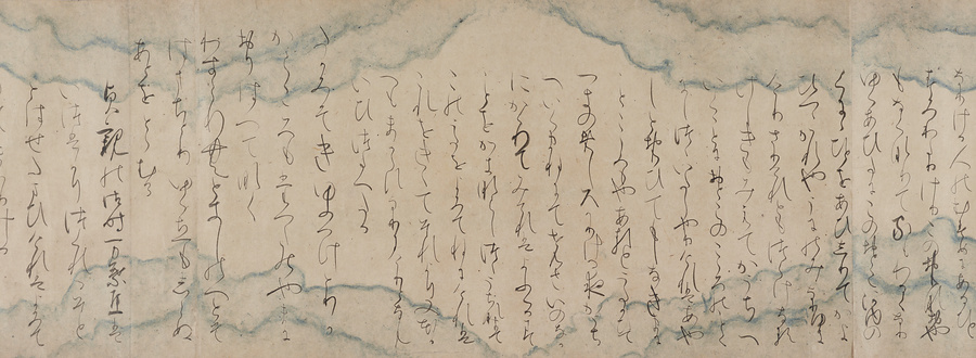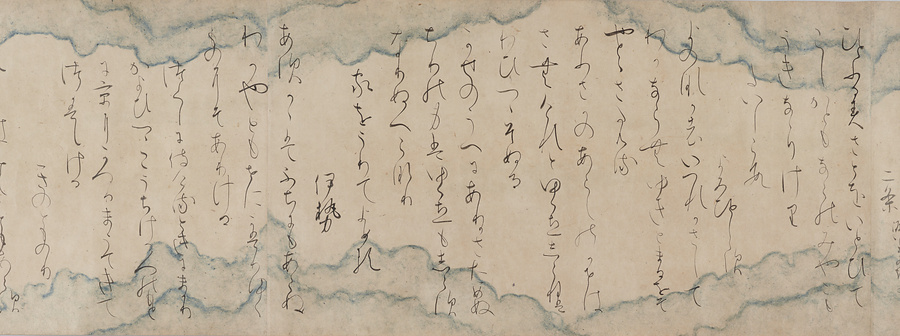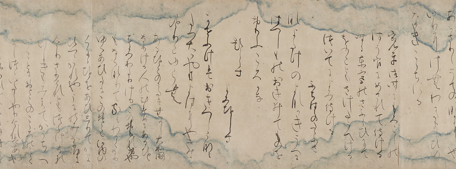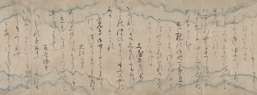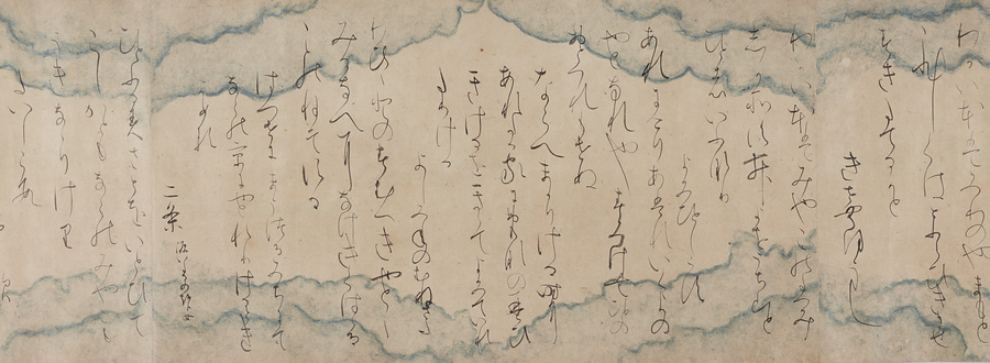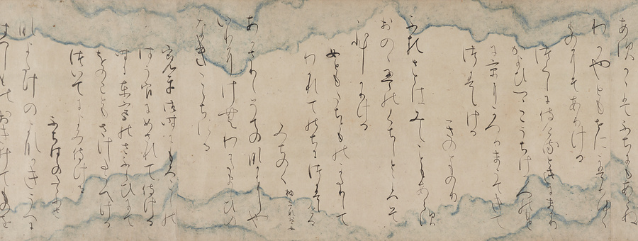 上下に藍の繊維を漉きこんだ雲紙に、伏見天皇が『古今和歌集』巻第18雑歌下の23首を書写したもの。『後撰和歌集』『拾遺和歌集』と合わせて60巻に及ぶ調度手本であった。『後撰和歌集』巻末の「永仁二年」の奥書から、伏見天皇30歳頃の筆であることがわかる。ルビ:あい、せんい、すきこんだ、くもがみ、ごせんわかしゅう、しゅういわかしゅう、ちょうどてほん