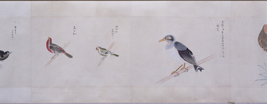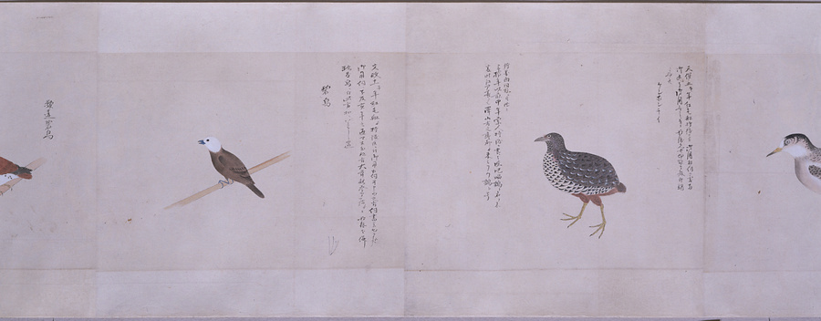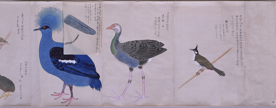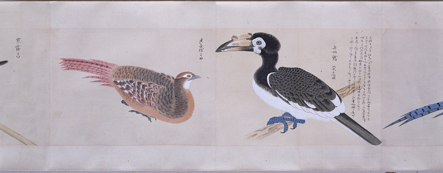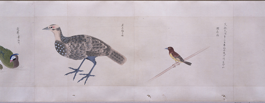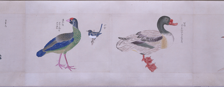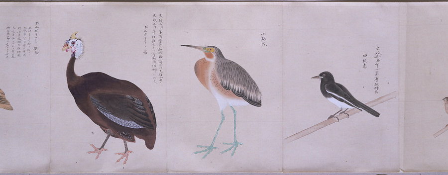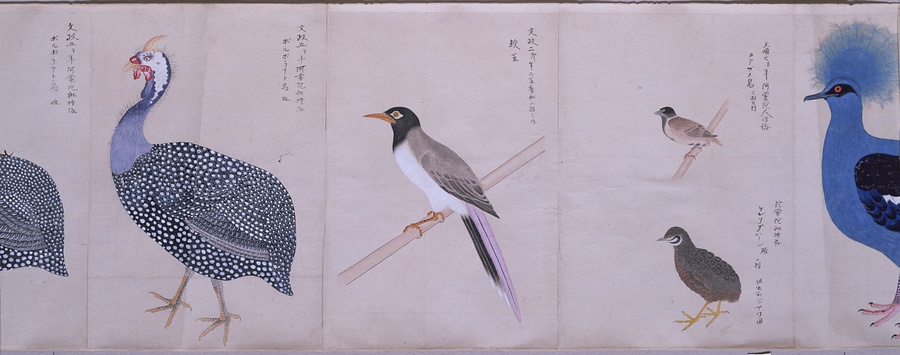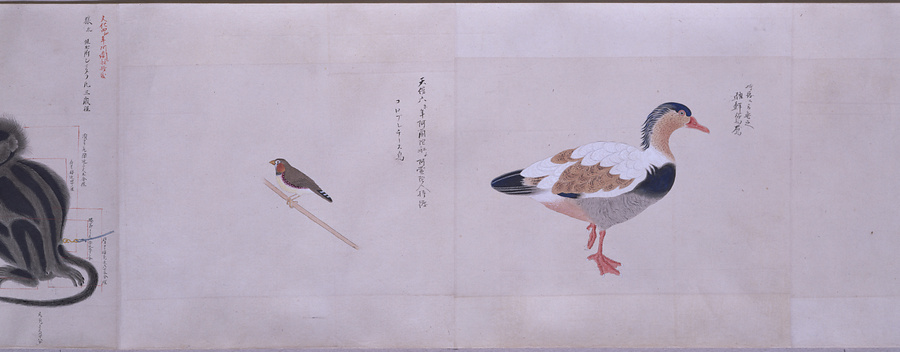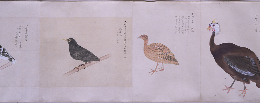中国、オランダの船で輸入された鳥獣の博物図譜で、名称と渡来年などを記す。幕府に報告用の『唐蘭船持渡鳥獣之図』(慶應義塾大学蔵)と酷似する図や、大名の飼育する鳥なども含まれる。長崎奉行所の控図をもとに、文政から天保年間(1818~29)に写されたと思われる。