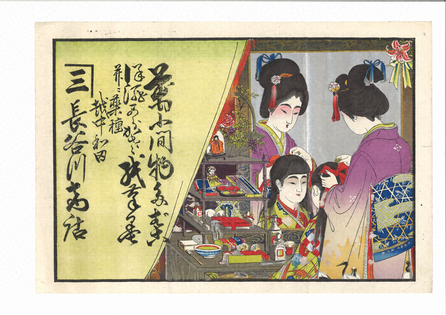 印刷技術も木版(もくはん)から、明治以降の石版(せきばん)・活版(かっぱん)印刷と技術の発達にともない、色彩の鮮やかさや濃淡の表現を可能にした。特に正月用の引札が多く、版元(はんもと)(印刷所)は歳末が近づくと、見本帳を持って全国の商店からの注文をとってまわる。そのため、現在の企業名入りカレンダーのように、なかには全く同じ図柄のものもある。
