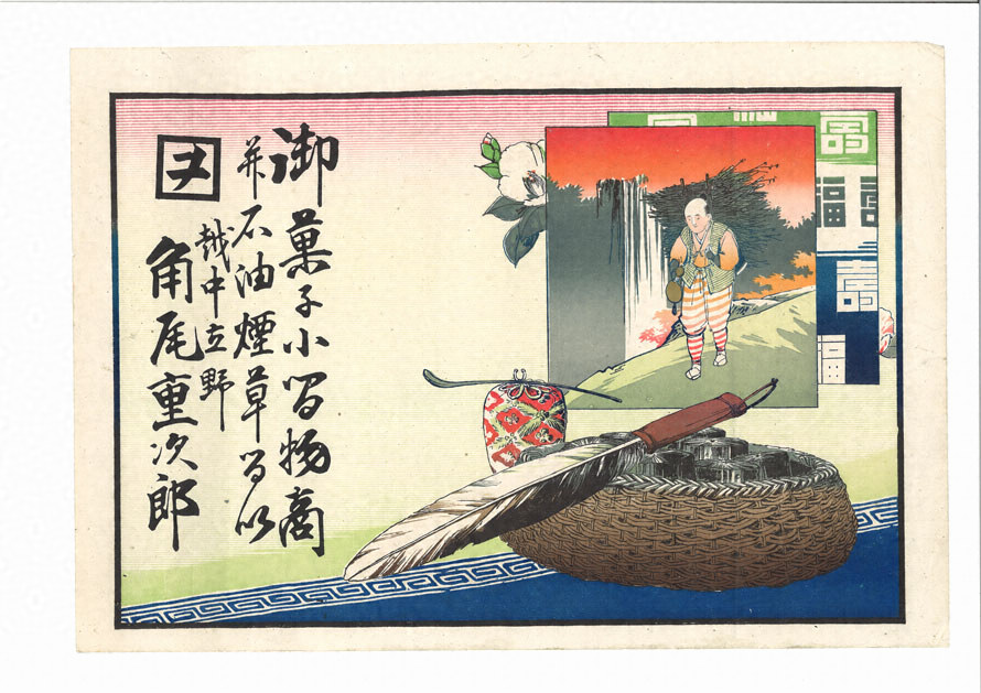 【1】引札「御菓子小間物商 并石油煙草るい/越中立野 角尾重次郎」