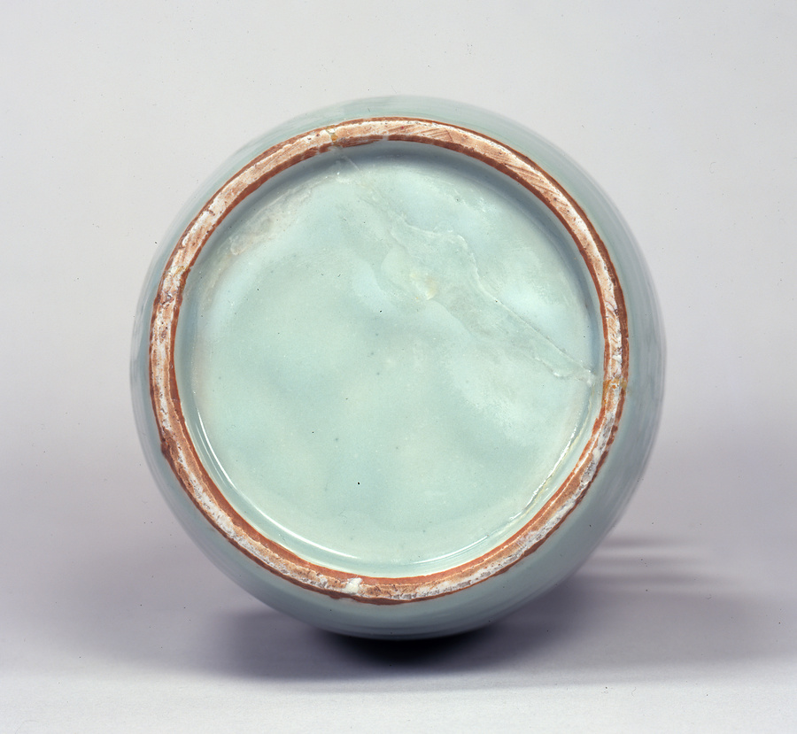 一口に青磁といっても、作られた窯や時代によってその色あいは様々です。この作品は、中国の南宋時代から元時代に、現在の浙江省(せっこうしょう)南西部にある龍泉窯(りゅうせんよう)で作られたもので、不透明な淡い青色が特徴です。この青を粉青色と呼びます。日本人は古くから龍泉窯の青磁の優品を「砧青磁」(きぬたせいじ)と呼んで愛好してきました。青磁といえばこの色合いを思い浮かべる人も多いのではないでしょうか。