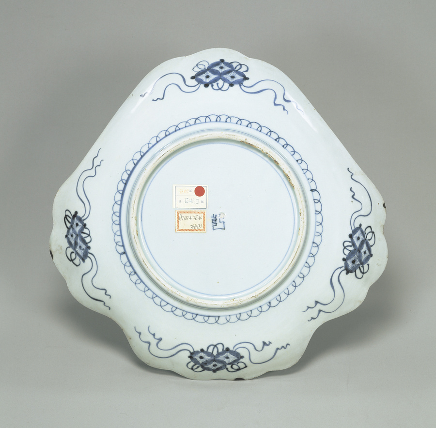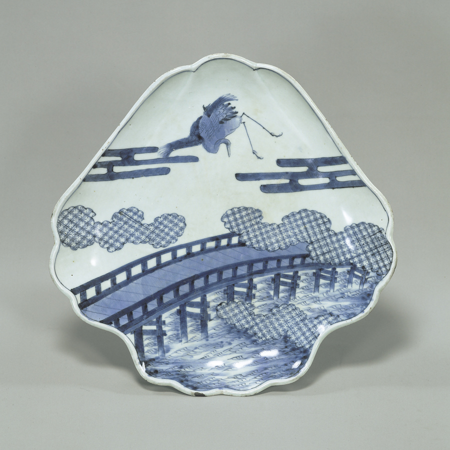 染付橋に鶴図富嶽形大皿