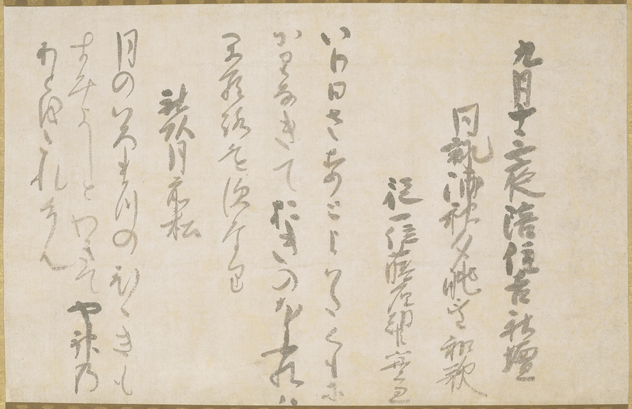 実兼は従一位太政大臣<だじょうだいじん>に累進し、関東申次<もうしつぎ>の重職を帯び公武交渉の要にあった。この懐紙は摂津の住吉社における歌会で執筆したもの。記された官位より実兼の41歳から50歳までの筆跡と知られる。詳しく丁寧な端作(はしつくり)などは懐紙の書式の変遷を見る上でも貴重である。