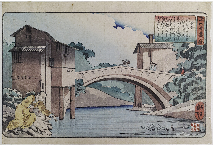 山へ薪採りにいった曽参は、客のもてなしに困り彼の帰りを願って指を噛む母親に胸が痛み、帰宅を急ぎます。強い孝行の気持ちが離れている母の意志をも感じ取るという話です。真っ白の雲が湧き立つ空を背景に、色面による陰影表現を用いて幽玄な雰囲気が漂う河畔の風景を見せます。風景画として破綻なくまとめられた本図においては、独特のポーズを見せる母親の表現のほかに、一見原本の存在を感じさせるものはありません。石橋や左岸の建物などは、このシリーズに多用される『東西海陸紀行』のバタヴィアの風景を参考にしたのかもしれません。