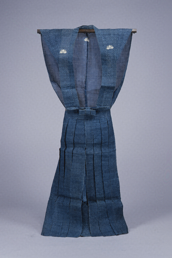 袖無しの上衣である肩衣と袴とを共布で縫製した単仕立。通常は麻製。藍の濃淡で小紋を全身に染め、両胸と背中、および袴の腰板に、白く染め抜いて上絵を施した家紋がつく。正式には長袴を用い「長裃」と称するが、日常には半袴による「半裃」を着用した。(かたぎぬ はかま ともぬの ひとえじたて)