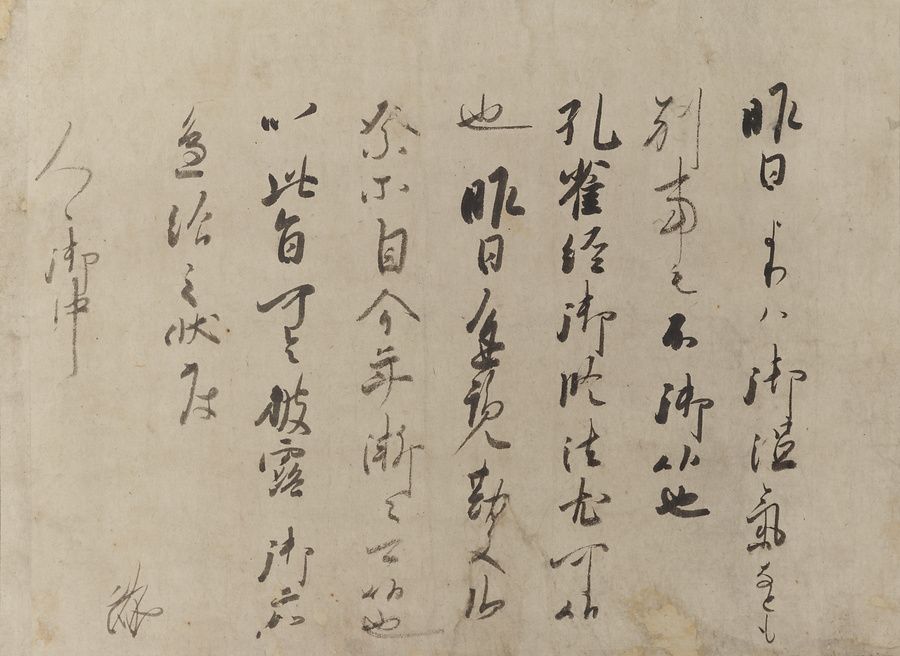 摂政・関白を務め、書にも優れた藤原忠通の手紙です。後白河上皇の院司宛てと推測され、病の上皇を気遣い、病気平癒の祈祷には孔雀経の御修法(孔雀明王を本尊とする密教の祈祷法)がよいと勧めているようです。粘り強さをそなえた忠通の書のなかでは穏やかな書きぶりです。