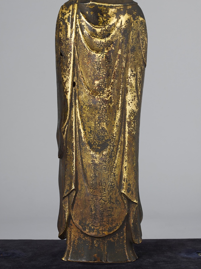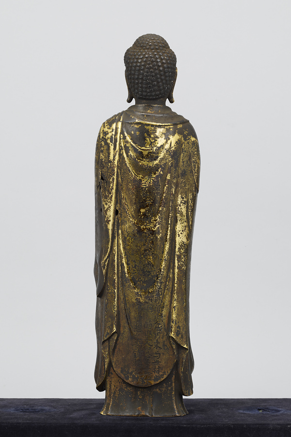 阿弥陀如来の背中には銘文(めいぶん)が刻まれており、これが善光寺の阿弥陀如来を模して作った、光背(こうはい)付きの三尊像であること、1254年に現在の栃木県那須(とちぎけんなす)地域で制作されたことが記されています。日本の仏像の歴史においては、由緒ある仏像に信仰が集まり、その模像が作られるということがしばしばありました。善光寺式三尊像は、その最も典型的な例といえるでしょう。