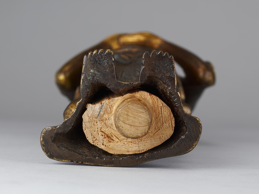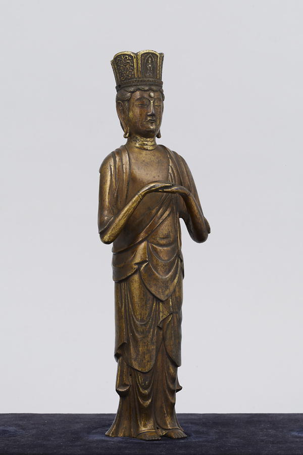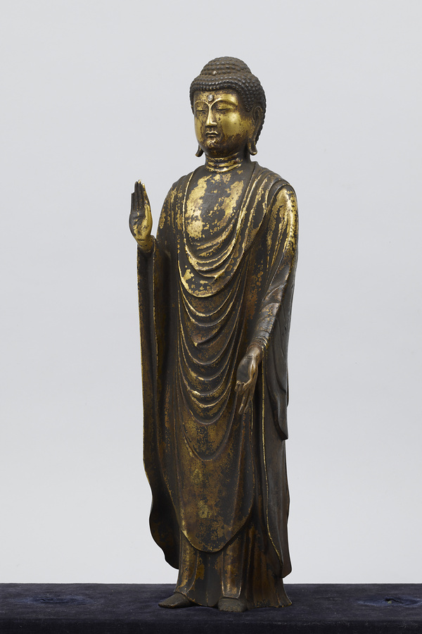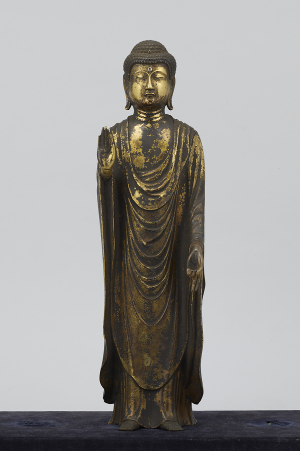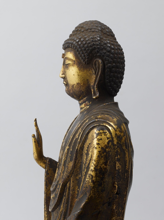 阿弥陀如来・観音菩薩・勢至菩薩の三尊は、日本ではセットで配置されることが多くありました。しかしこの像では、阿弥陀如来の指の曲げ伸ばしや、2体の菩薩の手のポーズに、ほかの阿弥陀三尊像と、やや異なる特徴があります。これは、現在も全国的な信仰を集めている、長野県の善光寺(ぜんこうじ)の本尊・阿弥陀三尊像を模した像と考えられています。善光寺の本尊は、6世紀中ごろ百済(くだら)より伝来したとの伝承があり、以後けっして誰も見ることができない「秘仏」(ひぶつ)とされてきました。11世紀ころより、極楽往生を願い阿弥陀如来を信仰することがさかんになるにつれ、善光寺本尊である阿弥陀三尊像への信仰も強まります。そして12世紀の末期ころから、善光寺の本尊を模したものである、という伝承をもつ像が作られはじめ、その動きは全国に広がっていきました。善光寺の本尊は秘仏で見ることができないため、その姿を礼拝したいと願う人々により、模像が作られたのです。それらの模像は、今ごらんになっている三尊像と同じ姿やポーズをしています。この形式を「善光寺式三尊像」(ぜんこうじしきさんぞんぞう)といいます。善光寺式三尊像は現在、全国にじつに200点以上が残っています。ふつうは三尊の背後に「光背」(こうはい)という板状の飾りが立てられていますので、この三尊像にももとは光背があったと考えられます。青銅製で金メッキしていることや、阿弥陀三尊のポーズは、6世紀から7世紀の仏像にも共通する部分があるといわれています。同じ時期に制作された仏像が、法隆寺宝物館にたくさん展示されていますので、ぜひ比べてみてください。