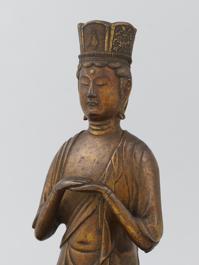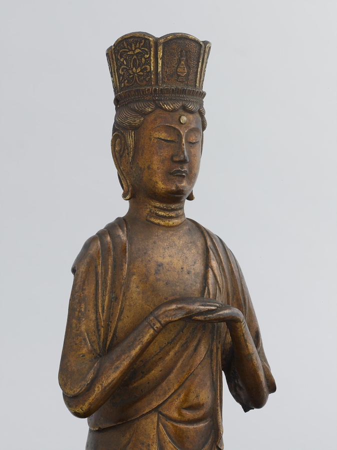 この像は、阿弥陀如来とそれに付き従う2体の菩薩、いわゆる阿弥陀三尊像(あみださんぞんぞう)です。銅に少しの錫(すず)をまぜた「青銅」(せいどう)を鋳造(ちゅうぞう)して作り、表面に金メッキをしています。中央の阿弥陀如来は、右ひじを曲げ、手のひらは5本の指を伸ばして胸の前に置き、左手はまっすぐ下におろし、人差し指と中指を伸ばしています。向かって右の菩薩は冠に如来の像、左の菩薩は冠に瓶(びん)をあらわしているので、それぞれ観音菩薩(かんのんぼさつ)、勢至菩薩(せいしぼさつ)と特定できます。2体とも胸の前で両方の手のひらを上下に重ねたようなポーズをしています。