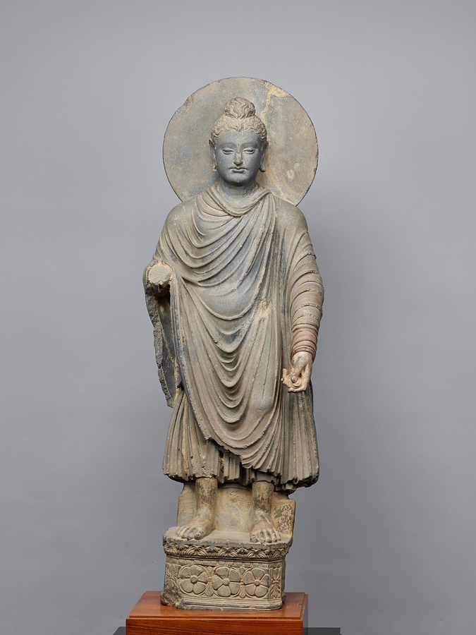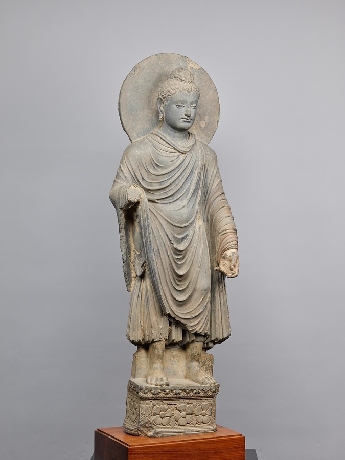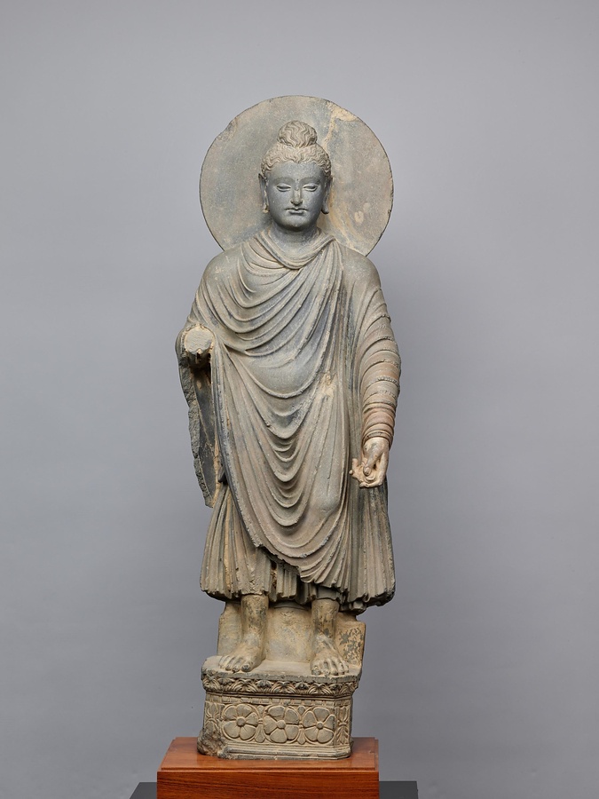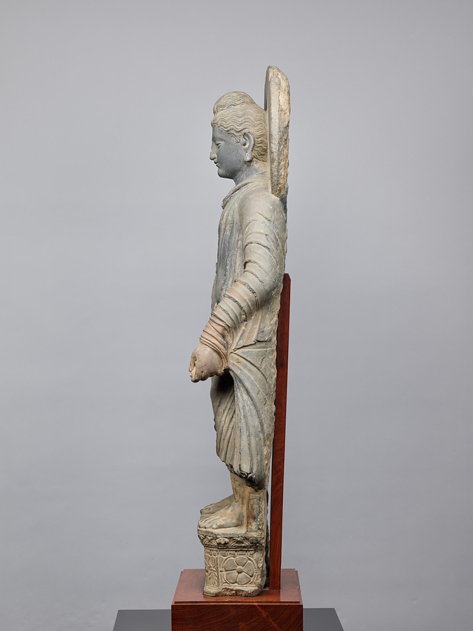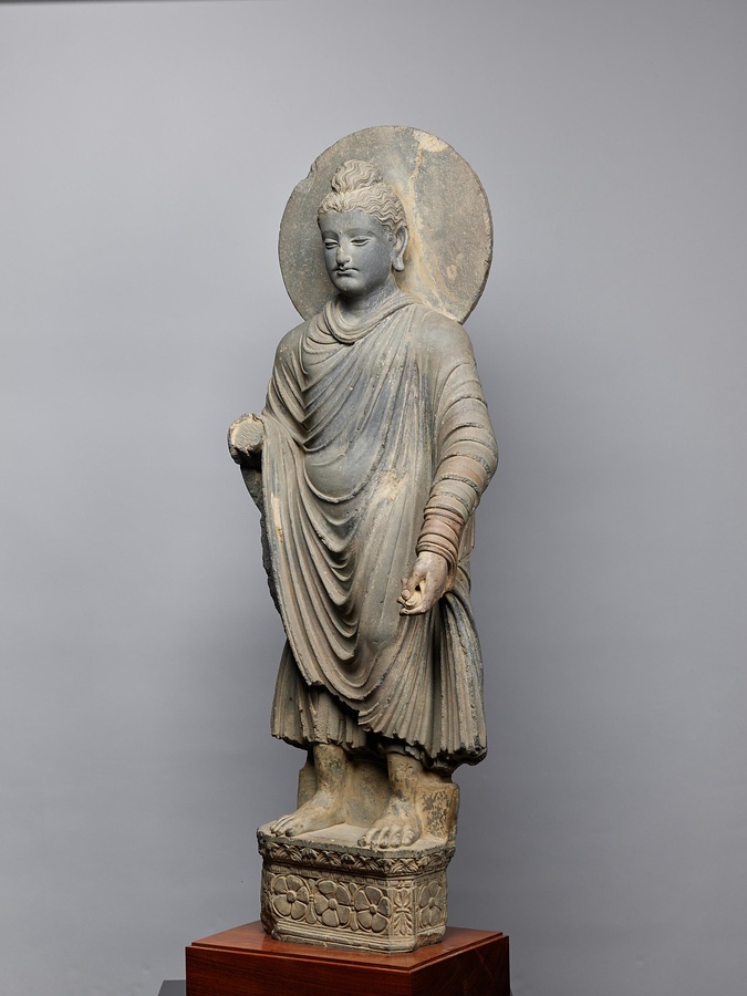 ガンダーラの仏像は、ギリシャ彫刻の影響を受けた、写実的な表現に特徴があります。彫りの深い顔、波型の頭髪、両肩をおおう衣の流れるような襞{ひだ}にその特色があらわれています。腹部のふくらみ、左膝を軽く曲げた様子が衣を通してうかがえる点も巧みです。
