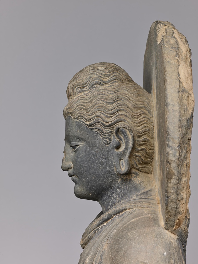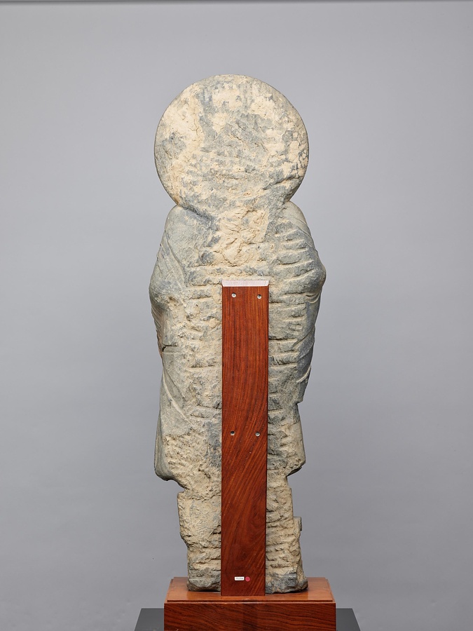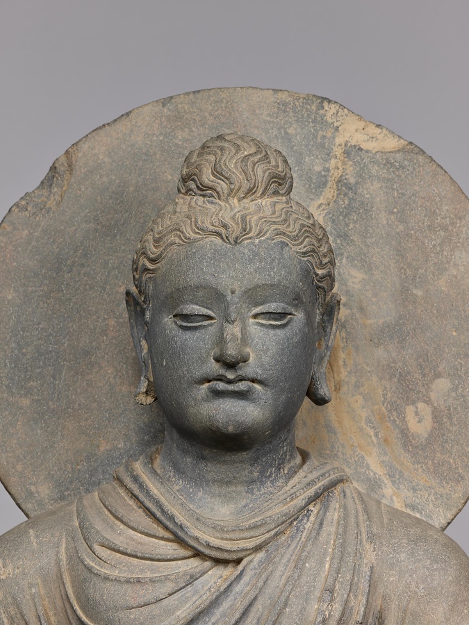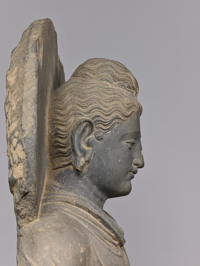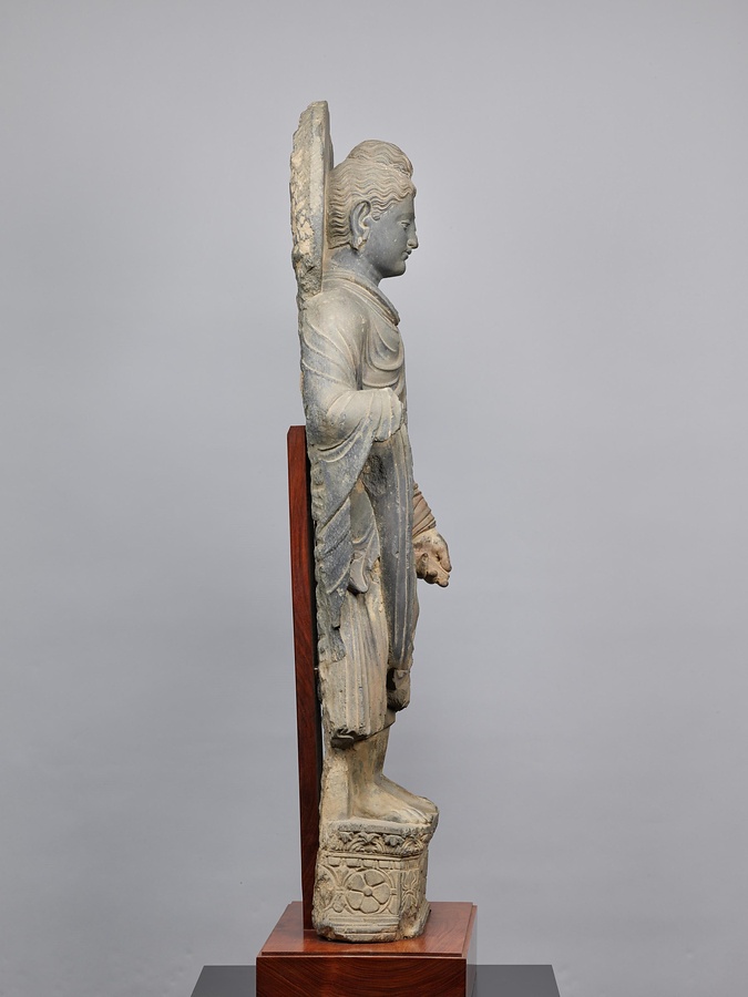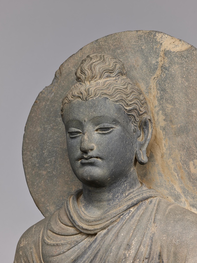 ガンダーラの仏像は、ギリシャ彫刻の影響を受けた、写実的な表現に特徴があります。彫りの深い顔、波型の頭髪、両肩をおおう衣の流れるような襞{ひだ}にその特色があらわれています。腹部のふくらみ、左膝を軽く曲げた様子が衣を通してうかがえる点も巧みです。