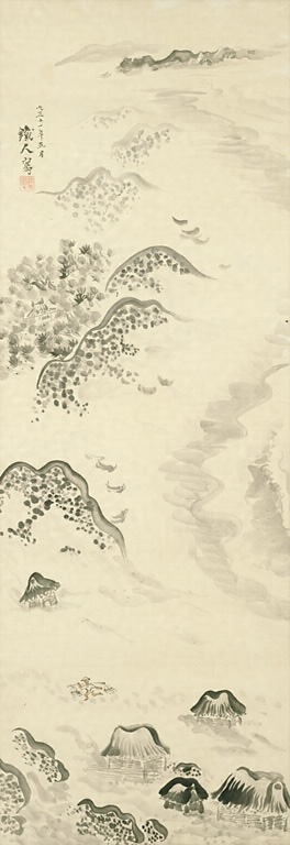 茅ケ崎時代の水墨画への本格的な取組みは、彼の造形思考の展開と深く結びつく。西洋の絵画思潮との格闘の果て肉体的、精神的に苦境に陥った彼は、それを打開する活路を日本の伝統的な南画に求めた。この絵が描かれた大正11年は、水墨画による個展を開くばかりか、南画の革新性を巡る文芸評論家との雑誌での論争や、浦上玉堂、池大雅に関する文章の発表など彼の南画研究が頂点を迎えた年であった。本作は萬の水墨画の典型的作例で、湾曲した海岸線、重畳する砂丘、家屋、小船など、様々な形象がリズミカルに配置され、透視図法によらずに奥行きを感じさせる特異な絵画空間が生み出されている。彼は浦上玉堂論の中でその作品に接した時「看者の受けるものは、一つの統一を得たリズムである。筆のリズム、墨のリズム、無論それは人のリズムである」「カンジンスキーなどのものに共通する、或るものがある」と述べているが、この言葉は彼自身の水墨画の特色をも的確に言い当てている。