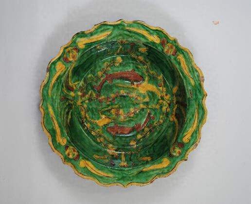 華南三彩印花魚藻文稜花盤