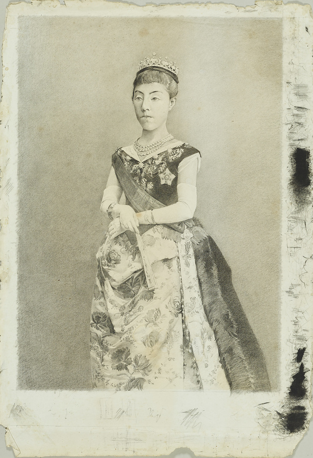 昭憲皇太后は一条家に生まれ、名は美子+はるこ+。慶応3年(1876)女御、翌年皇后となった。維新後は近代国家の君主として、明治天皇とともに産業、教育、社会事業の振興に尽力した。この洋装の皇后像は、明治22年(1889)に撮影された写真をもとにしている。