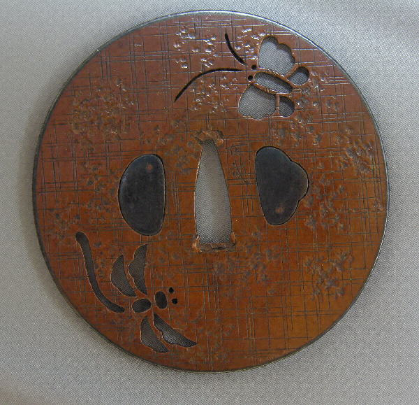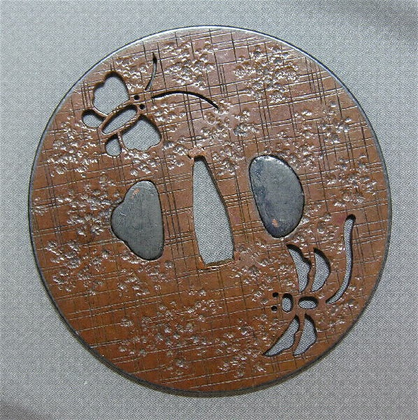 在哉にはこうした真の丸形もある。石目地に、格子に引いた毛彫も得意のもので、蝶と勝虫の小透もよくきいている。
