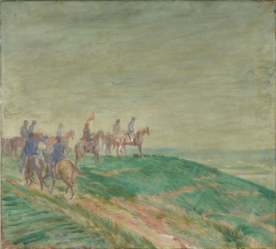 明治23年に、愛知県知多半島一帯で行われた陸海軍合同大演習の模様を描いている。先頭にたって指揮するのは明治天皇である。本図は聖徳記念絵画館の壁画のための下図で、壁画は長原の死後昭和6年、息子の坦がこれを引継ぎ完成させた。(旧台箋)