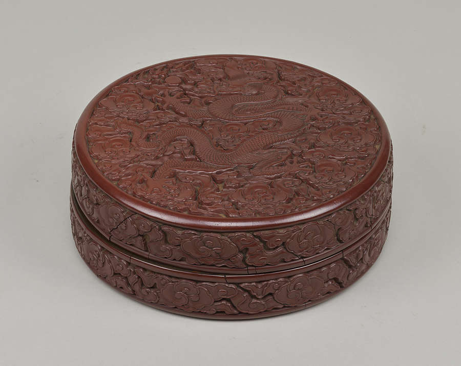 合子とは身と蓋からなる円形の箱、堆朱とは朱漆(しゅうるし)の彫漆のことです。この作品では、全体に堆朱による装飾が施されています。器の全体に雲が沸(わ)き立っており、蓋の上では1頭の龍が、体をくねらせ手足を広げたダイナミックな動きでポーズを決めています。身の底裏には銘文(めいぶん)があり、1426年から1435年の宣徳年間に制作されたことがわかります。雲と龍のデザインをあらわした漆工品は、中国では伝統的に作られましたが、このように一頭の龍を大きく堂々とあらわし、その周りを雲で埋め尽くした構成は、明時代前期の官営工房で制作された作品に典型的な図柄であり、数多くの類例が知られています。朱色が少し暗く、彫刻がやや平面的である点も、宣徳年間の堆朱の特徴です。