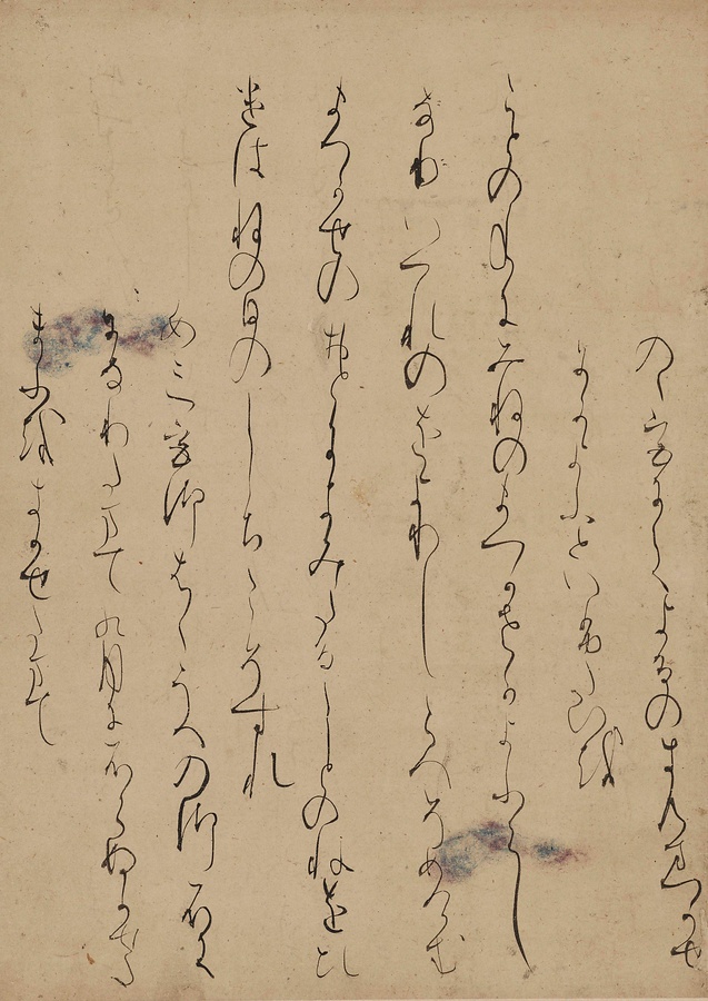 『斎宮女御集』という和歌集の断簡です。藍と紫の飛雲を浮遊させ、雲母を全体に撒いた料紙を用いています。きわめて繊細で流麗な筆致で揮毫し、料紙と美しい調和を見せています。「小島切」の名は、江戸初期の光悦流の能書・小島宗真の愛好にちなむものと伝えています。 ルビ:とびくも、きら、ま(いた)、りょうし、きごう、こうえつりゅう、のうしょ、こじまそうしん