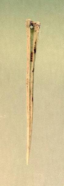 鹿の中足骨を4分割し、先端を削って尖らせている。長さ19.4cm。縄文時代。河北町南境貝塚。