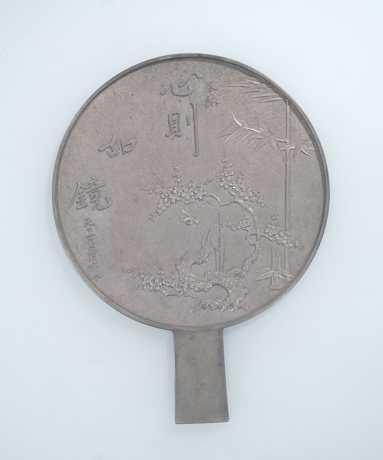 鏡背に梅と竹樹を配し、左方に「心則ち鏡の如し」の文字を表す。左端には作者名の銘文が鋳表される。大きな径に比して太く短い柄は、江戸時代後期の特色。乱用のため一時は禁じられ、後に解禁となった「天下一」と受領国名が併用されている。