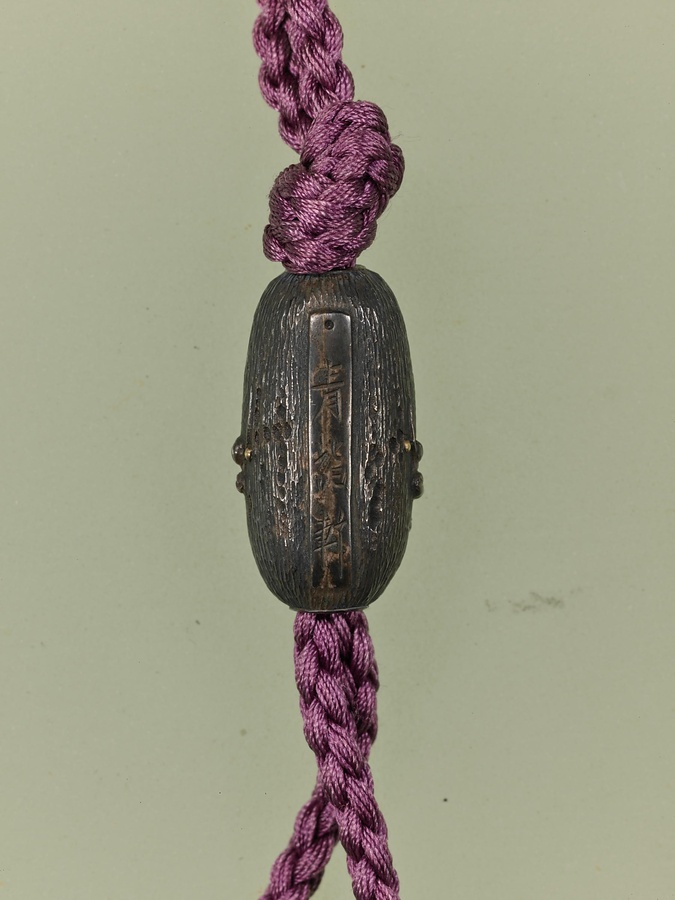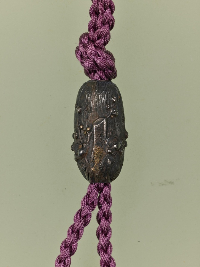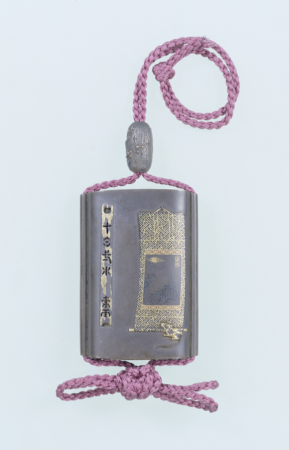 印籠は薬などを入れて腰から下げる小型の容器で、薬籠〓やくろう〓ともいいます。印籠には木製漆塗りや牙角〓げかく〓製などがありますが、まれにこうした金属製品もみられます。本品には立体的な彫刻や他の金属を嵌〓は〓め込んだ象嵌〓ぞうがん〓の技法が用いられており、江戸時代の極小芸術の一端を示しています。