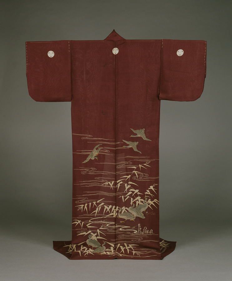 第11代将軍徳川家斉(1773~1841)の娘、溶姫(やすひめ)に仕えていた小姓が、寛政5(1793)年に溶姫より拝領したと伝えられる夏のきもの。伝統的な日本の模様「芦に雁」が腰下に表わされ、五所紋には三つ葉葵紋が染め抜かれています。