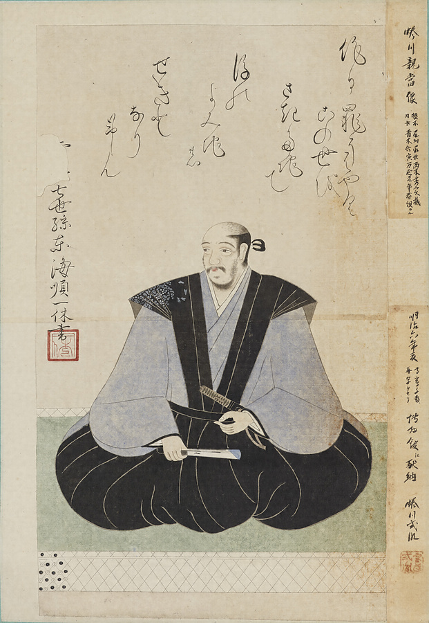 蜷川親当(?~1448年)は足利義政に仕え、義政死後に出家し、智蘊と号した。連歌中興の祖と呼ばれ、多くの連歌を残している。僧・一休とも親交があったとされ、本作の上部にも一休の賛が見える。親当とは分族にあたる蜷川式胤が博物館に寄贈したもの。(智蘊ちうん  蜷川式胤にながわのりたね)