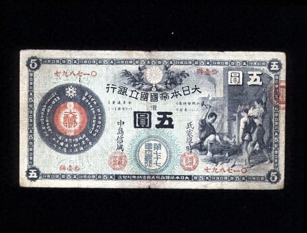 明治初期に仙台の第七十七国立銀行が1878(明治11)年から発行した紙幣の一つで、大蔵省が製造し全国の国立銀行が一部加筆して発行しています。五円紙幣の表の図柄は鍛冶屋です。