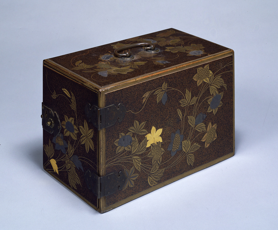 上面に提鐶(さげかん)をつけ、内に三段の引き出しを収めた箪笥。身の回りの小物や書類、筆記具を携行するためなどに使われた。表面には金の薄肉高(うすにくたか)蒔絵に金銀の金貝(かなかい)を交えて、鉄線の花と葉を流麗な筆致で描いている。江戸時代に入り、華美な傾向を深めてゆく蒔絵の様相を示している。(20120626_h081)