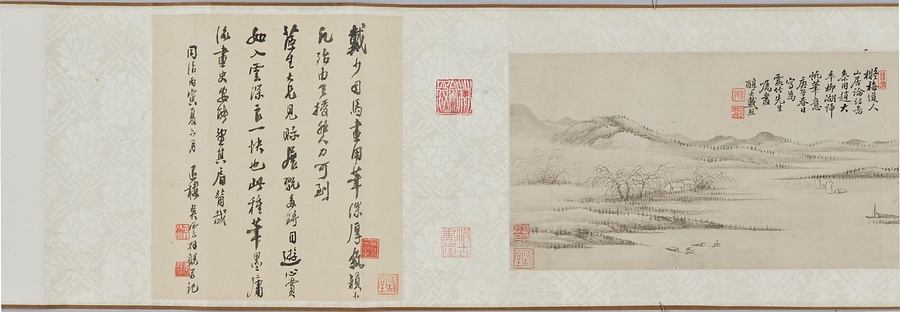 銘文:擬梅道人山居論詩圖兼用趙大年柳湖歸帆筆意、庚子春日寫、為霧所先生嘱畫、醇士戴熙 ; 鈐印「鹿牀」 ; 戴熙 ; 引首印「習苦」 ; 莫友之 ; 呉雲 ; 鑑蔵印「芸浦過目」 ; 定静堂 ; 汲古書屋 ; 林宗毅 ; 定静堂収藏印 ; 志超鑑藏