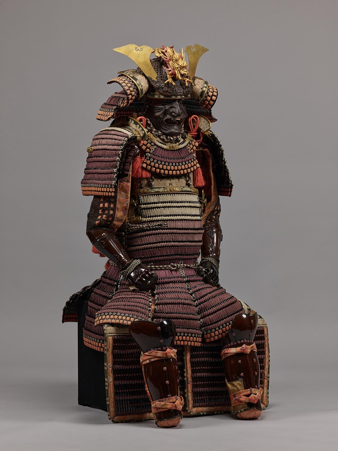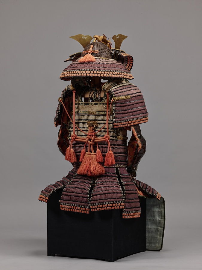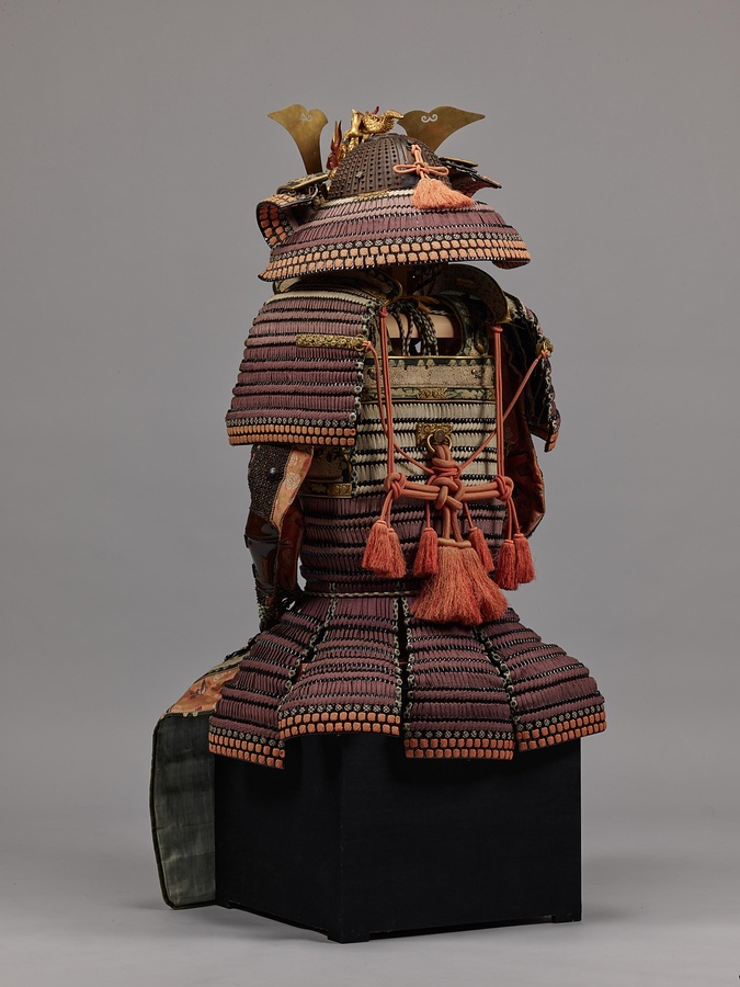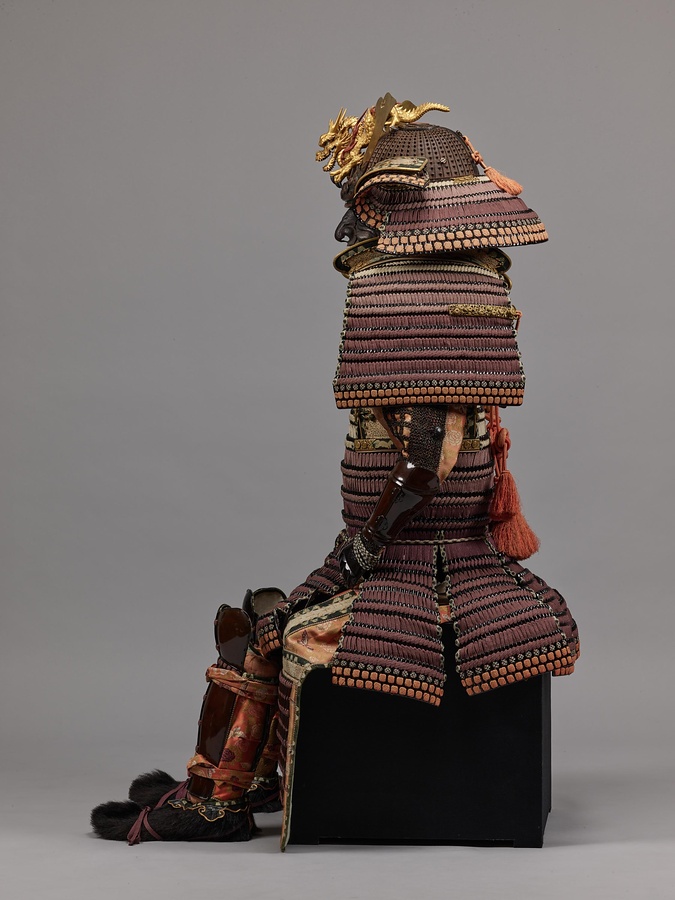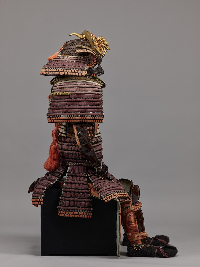 龍頭(たつがしら)の兜(かぶと)をはじめ籠手(こて)・脛当(すねあて)にいたるまで中世の甲冑を模した復古形で、(しころ)や胴・袖を白・薄紫・紫と裾に向かって色を濃く威した紫裾濃威の胴丸仕立ての具足である。袖の冠板(かんむりいた)のうらに「天保八丁酉二月吉辰」「明珍紀宗胤謹仕継之」の銘が切られている。(20050315_h05)(120724_h056)