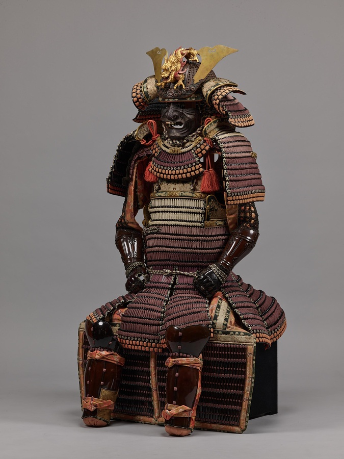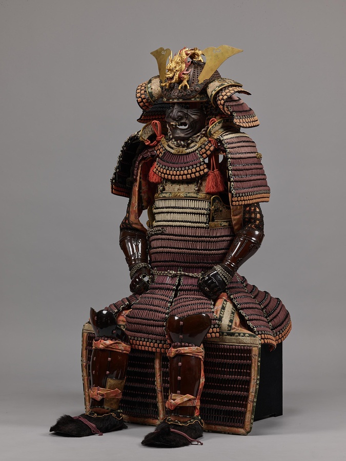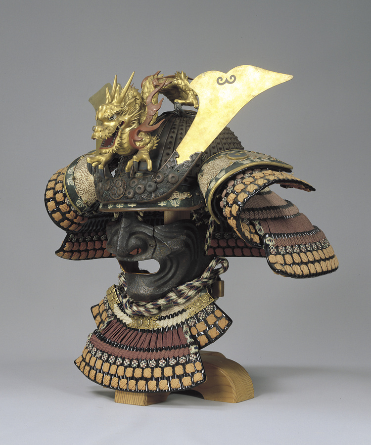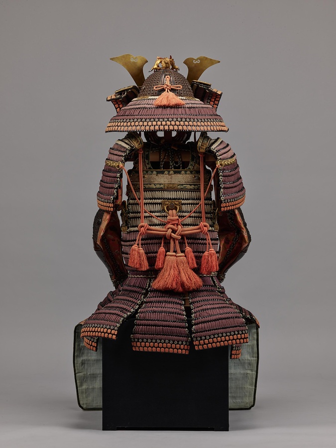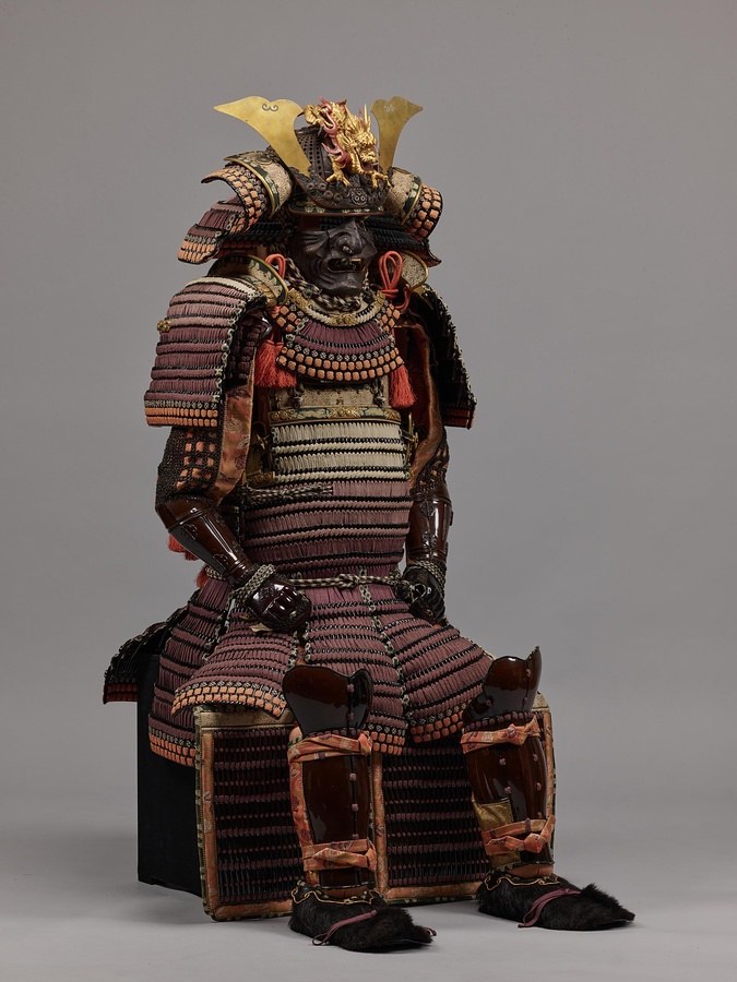 龍頭(たつがしら)の兜(かぶと)をはじめ籠手(こて)・脛当(すねあて)にいたるまで中世の甲冑を模した復古形で、(しころ)や胴・袖を白・薄紫・紫と裾に向かって色を濃く威した紫裾濃威の胴丸仕立ての具足である。袖の冠板(かんむりいた)のうらに「天保八丁酉二月吉辰」「明珍紀宗胤謹仕継之」の銘が切られている。(20050315_h05)(120724_h056)