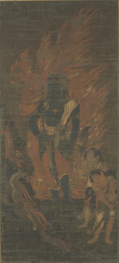 不動明王(ふどうみょうおう)は大日如来(だいにちにょらい)の化身で、おそろしい姿をし、仏教の教えをうながす役割を果たします。その体の色は青く、顔をしかめ右眉をぐっとあげ、唇の上下に牙をのぞかせています。右手に煩悩を切り裂く剣、左手には教えに従わない人々を縛って引っ張る索(さく)というロープを持っています。画面右側には、子どもの姿をしたおつきのものが二人描かれています。左側の矜羯羅(こんがら)は、蓮華の花を持ち、おとなしい顔つきで不動明王をみあげています。一方、右側の制吒迦(せいたか)は肌の色が赤く、こん棒を持ち、いたずらな表情を浮かべます。画面の左に描かれるのは、不動明王の剣の化身である倶利伽羅龍(くりからりゅう)です。背後には、燃え盛る炎が描かれています。これは、迦楼羅焔(かるらえん)といい、迦楼羅という伝説上の鳥が吐き出したもの、もしくは迦楼羅の姿をかたどったものです。作品をよく見ると、左側を向いた炎の鳥が、羽ばたこうとしているように見えてきませんか。不動明王の迦楼羅焔は画家によって描き方がさまざまですので、見比べてみるのも楽しみ方の一つかもしれません。