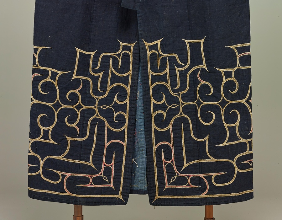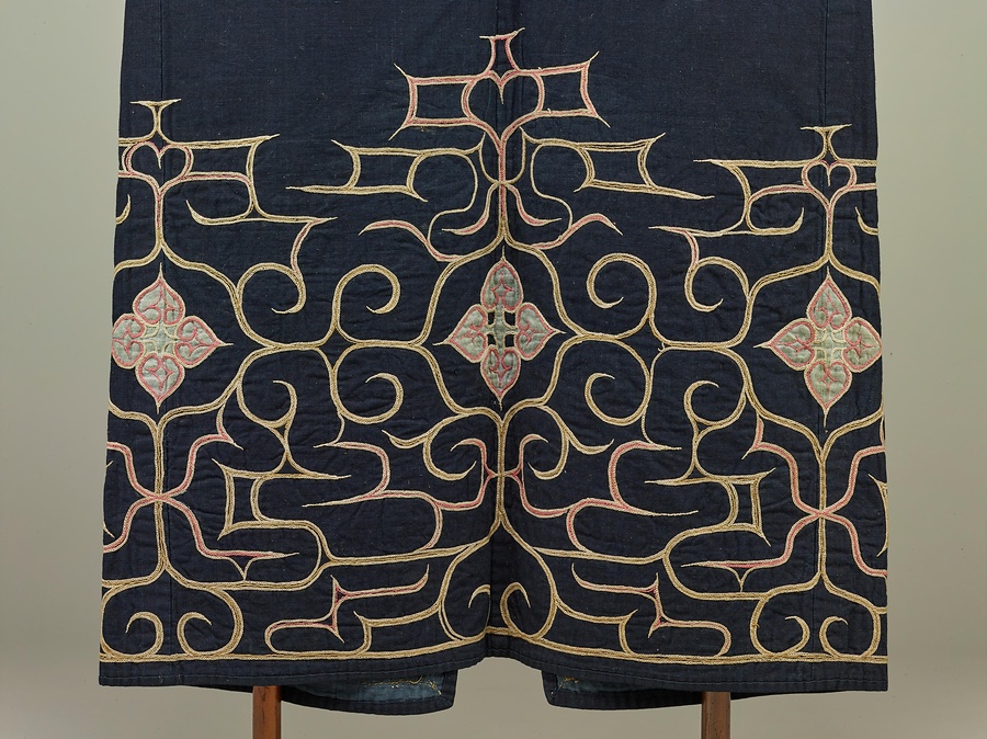 刺繍+ししゅう+のはいった紺木綿+こんもめん+の着物です。袖口、襟+えり+元、背、腰まわりに左右対称の文様構成で刺繍を施しています。後裾に花弁文の切伏せがあります。
