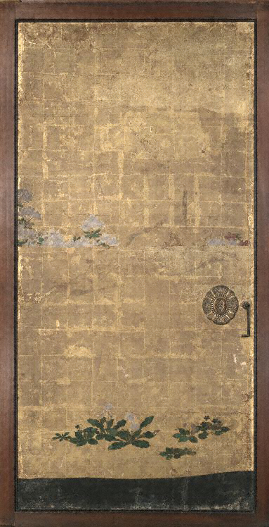 右方の芝垣の背後には桜が描かれる。画面中央から金雲の隙間に紅白の躑躅の花が見え隠れしながら左方奥の遠山へと続く。右方の芝垣と土坡は一の間西側戸襖、左方の遠山は南側の戸襖の図様へと連続した図様を見せており、一の間からこの間へと春の情景が展開していることが分かる。長押上小壁貼付は水墨によって右方の岩肌に囲まれた楼閣と家並から、帆船の浮かぶ水景へと移り、遠景には堤防や石橋を描く。この水景も二の間の南側の図様と連続しており、西側から南側の長押上の壁貼付へ向けて緩やかな山水図を展開する。