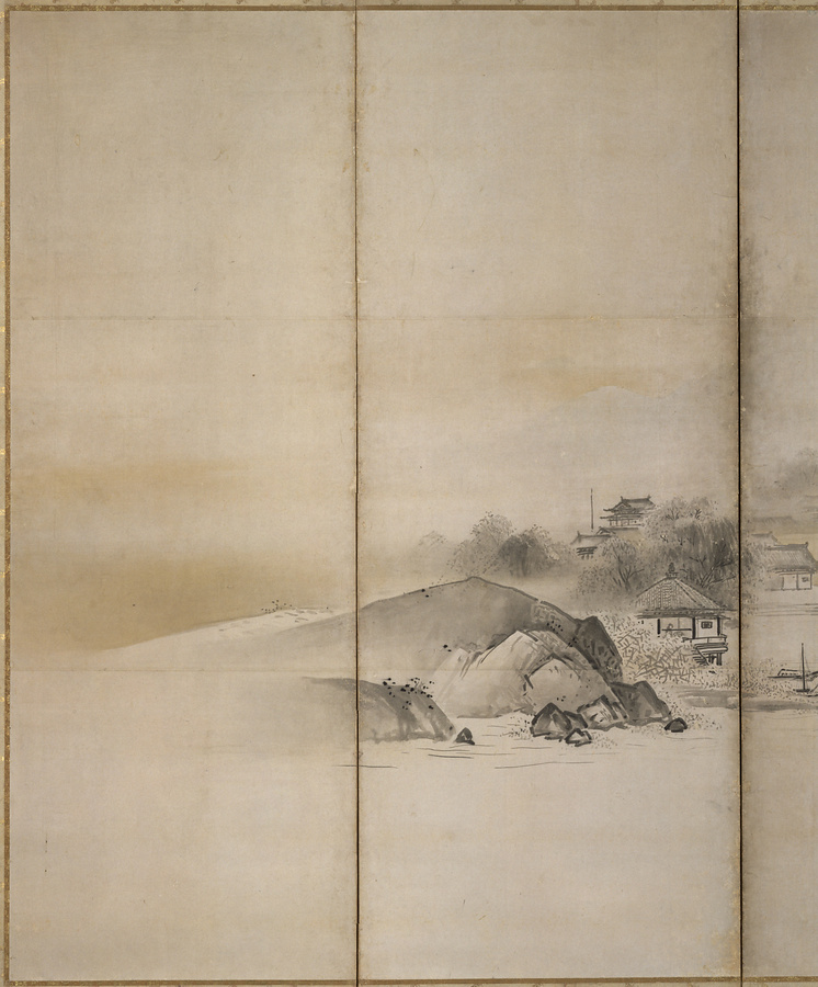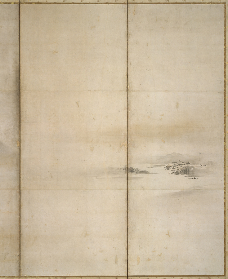 探幽の後見役である狩野興以@こうい@の「山水図屏風」の構図に近く、各隻を左右反転すると、右隻は興以画の左隻に、左隻は興以画の右隻にちかいものとなる。広く余白を設け、両隻で水平方向の広がりと垂直方向の高さの対比をつくる山水構成は、探幽ならではの工夫だ。