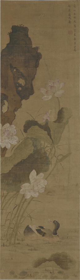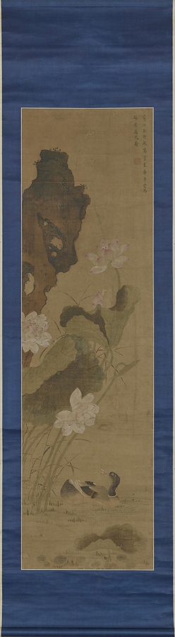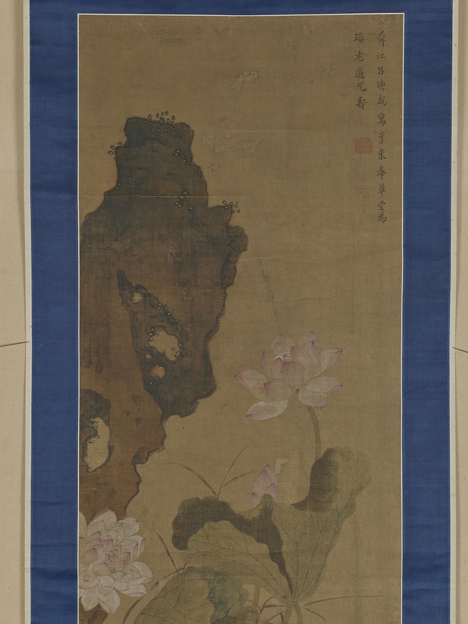 姜泓は銭塘(浙江省)の人で、呂煥成は余姚(浙江省)の人。左手の桃花が姜泓の筆、右側の蓮花が呂煥成によるものです。明治に活躍した南画家・江馬天香と村田香谷(1831~1912)の箱書きがあり、それ以前に日本に渡ってきたものだとわかります。