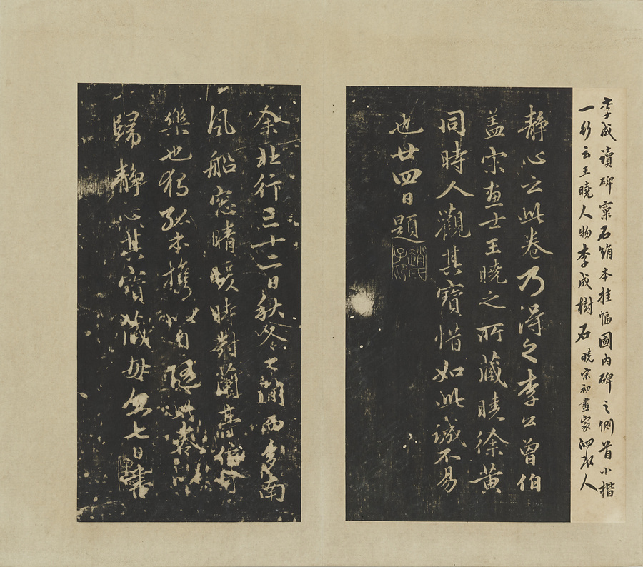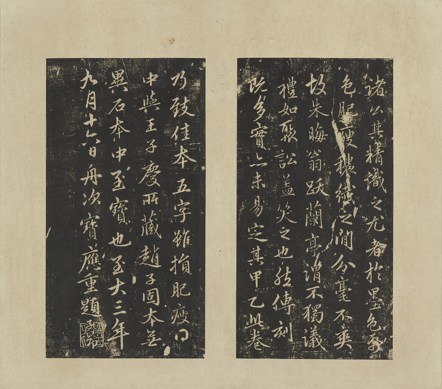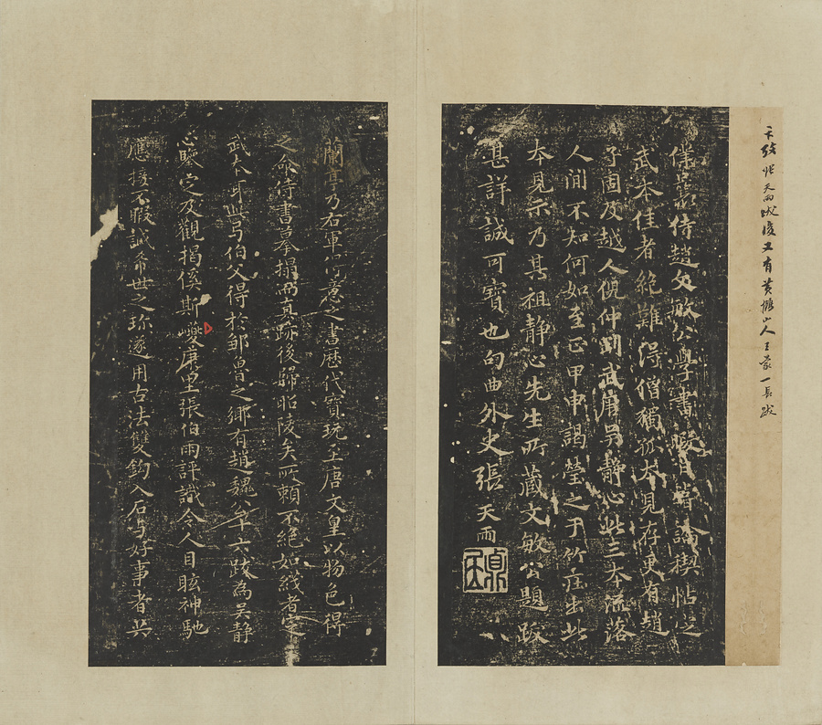趙孟頫は呉静心本定武蘭亭序に16の跋を付しました。多くが独孤@どっこ@本の内容と重複します。本作は宋の王暁@おうぎょう@の旧蔵本と呉静心本の2種の蘭亭序の刻本を合装した帖。清の翁方綱@おうほうこう@が随所に記した跋中には、英和@えいか@に相談されて独孤本を整理した際に、抜け落ちた2片に気付き本作に貼り込んだという内容も見られます。